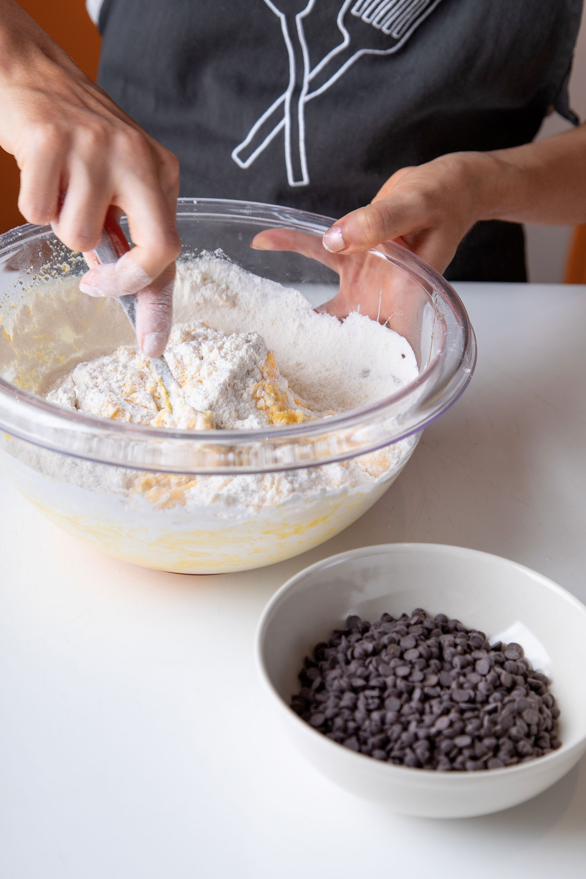In una ciotola lavorare il burro a temperatura ambiente con lo zucchero. Aggiungere le uova, la farina, il lievito e le mandorle, quindi mescolare fino ad ottenere un impasto omogeneo. Unire da ultimo le gocce di cioccolato e impastare velocemente.