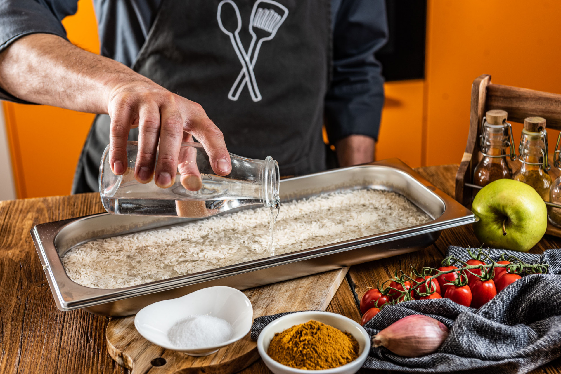 Disporre il riso basmati su una teglia in acciaio, aggiungendo il doppio del suo volume in acqua. Salare leggermente. Cuocere in forno in modalità Cottura con vapore a 100 °C per il tempo indicato sulla confezione.